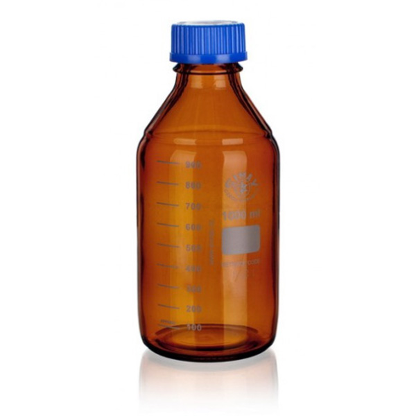 Fľaša reagenčná hnedá guľatá, s modrým uzáverom, GL 45, SIMAX a vylievacím krúžkom z PolyPropylénu (teplotná odolnosť do 140 °C).