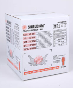 Laboratórne rukavice SHIELDskin ORANGE NITRIL 300 firmy ShieldScientific sú vysokokvalitné rukavice s mierne predĺženým rukávom pre zvýšenú ochranu. Tieto laboratórne rukavice sú vyrábané špeciálnou polymerizáciou s technológiou twinSHIELD. Táto technológia umožňuje vyrábať rukavice z 2 rôznych gúm : nitrilu a neoprénu (neonitril), takže tieto rukavice sú 2 vrstvové, čím sa zabezpečuje ešte vyššia ochrana pred poškodením Vášho zdravia. Tieto rukavice sú naviac vyrábané bez urýchľovačov polymerizácie takže sú vhodné aj pre ľudí s veľmi citlivou pokožkou.